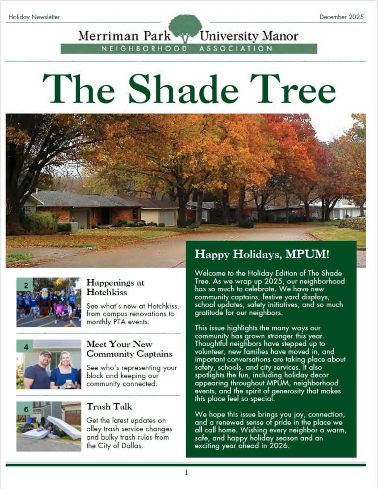 The Holiday Issue of The Shade Tree is out now and delivered to all homes. Inside you’ll find school updates, safety initiatives, city service changes, community captains, Yard of the Month winners, and highlights from around MPUM this year.